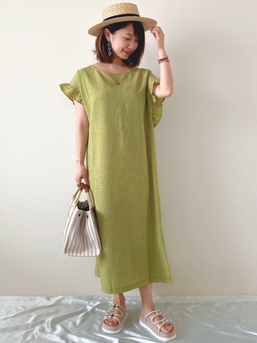 ライムグリーンコーデ🍋🌿 このワンピ、まわりに大人気♡ 着ると、褒められるワンピースです☺️ 1枚で、お出掛け仕様に♡ aquagarageさんのものだよ♩ RETELさんの とっても歩きやすいクリアサンダルを合わせてみました💠🐾 商品番号 retel01 23.5cmでXLサイズを履いてます♩ フラットなので歩きやすく、ベージュの縁で柔らかな印象に♡ どちらもインスタからチェックできます🌿 Instagram ▷▷@meme158cm PARTE