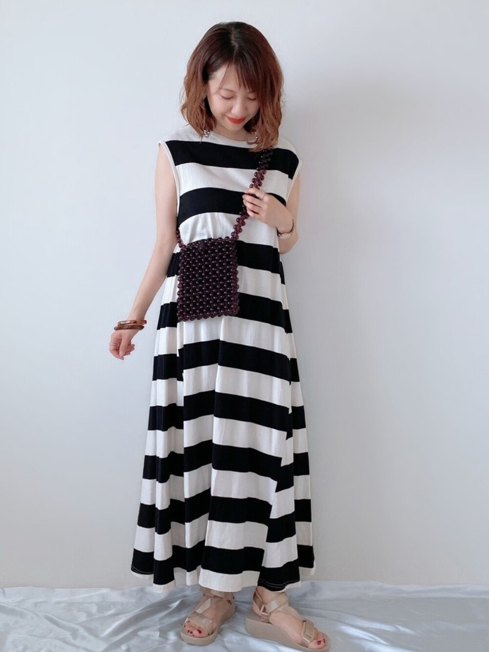 夏のモノトーン 🐼 𓂅 太ボーダーのワンピは去年のもの★ この前ゲットしたビーズバッグを合わせてみたよ𓂅𓂅 Instagram ▷▷@meme158cm PARTE