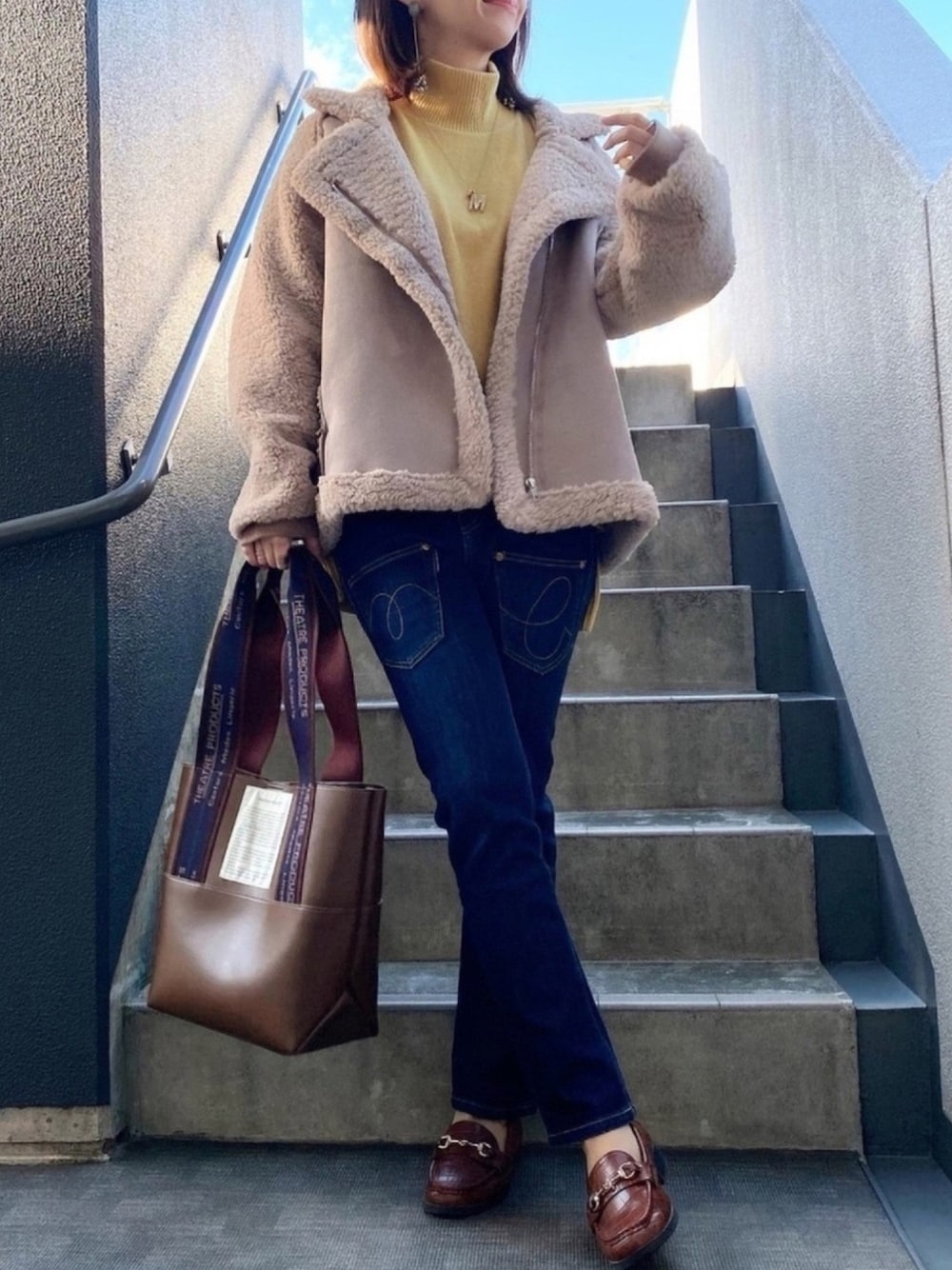 memeのムートンコート「ボアジャケット」を使ったコーディネート
