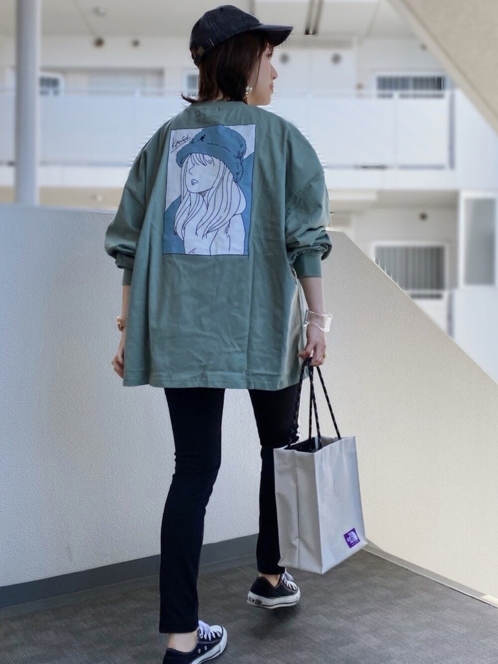 くすみグリーンが可愛いロンTがNew in🥑 キャップ🧢とスニーカー👟でメンズライクコーデ♡ 🔸 ZIP FIVE 🔸 【 別注・コラボ】 【ZIP FIVE×KANGOL / カンゴール バックプリントエモガールイラスト長袖Tシャツ ロンT】 グリーン / Lサイズ ユニセックスで着られるtops👫 バックプリントがお洒落で背中を見せたくなります🪞*・゜ 158cmの私でLサイズだとお尻が隠れるくらいの丈感で嬉しい🤎 お袖がキュッとなっていて、腕まくりをしても落ちてこないよ◎ カラバリも豊富です🎨 3月29日までタイムセールをしてるので、ぜひチェックしてみてね🔎🤎 Instagram ▷▷@meme158cm PARTE