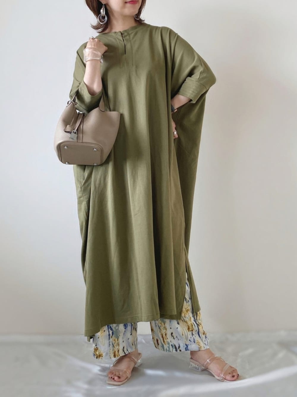 グリーンな人𓀠 🥑🦠 ロング丈のワンピに ペイント柄パンツをレイヤード🎨 バッグは とっても使いやすいレザーバッグ👜✨ 🔸 イマイバッグ 🔸 【キューブバッグ】S size イマイバッグさんで大人気の牛革のレザーバッグ🤎 グレージュは、とっても綺麗なニュアンスカラー🍪 レザーのシボ目が、品があります𓂃 𓈒𓏸 🔸 Moremore 🔸 【ペイント柄ストレートパンツ】 履くだけでオシャレ度UPなパンツは、たーーくさん愛用してます💛 Instagram PARTE ▷▷@meme158cm Sharee