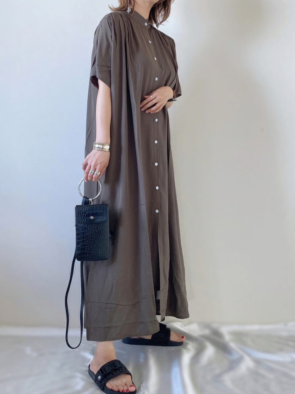 memeのシャツワンピース「スタンドカラー半袖シャツワンピース」を使ったコーディネート