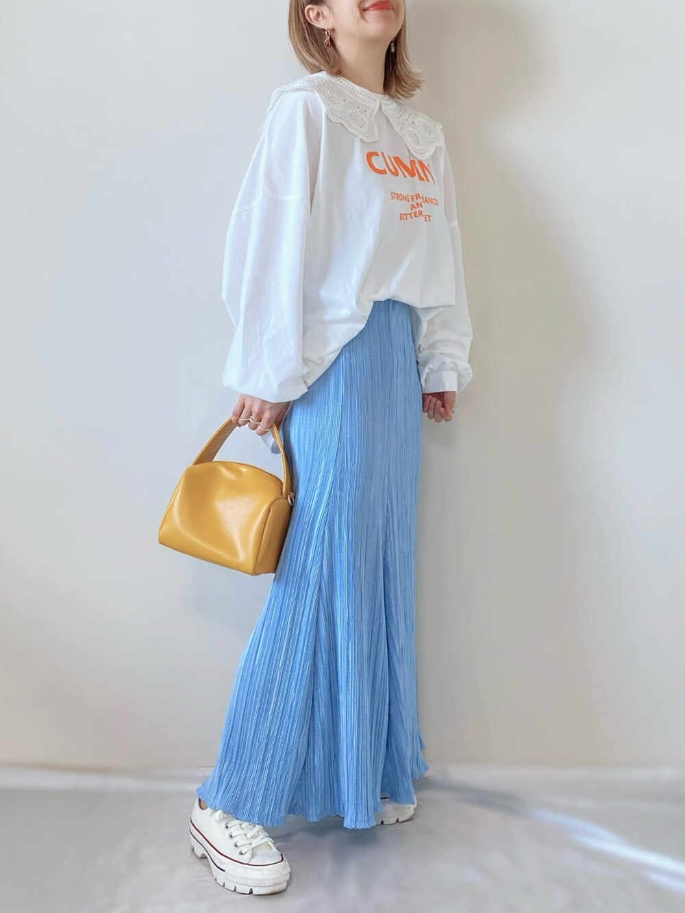 このスカート💙 ほんとお気に入り〜。 足を長〜く見せてくれます😂💛 🔸 66girls 🔸 【リンクルロングマキシスカート】 スカイブルー/FREE 鮮やかなブルーが春っぽ🐬 プリーツのマキシ丈で、ヒラヒラと動きが出て涼しげです🌿 ウエストゴムで、とっても楽ちん♡ 今回はロンT、バッグ、付け襟がパシオスのアイテムでプチプラコーデ!♡ 厚底スニーカーで更に脚長効果👟 Instagram PARTE ▷▷@meme158cm Lemon8
