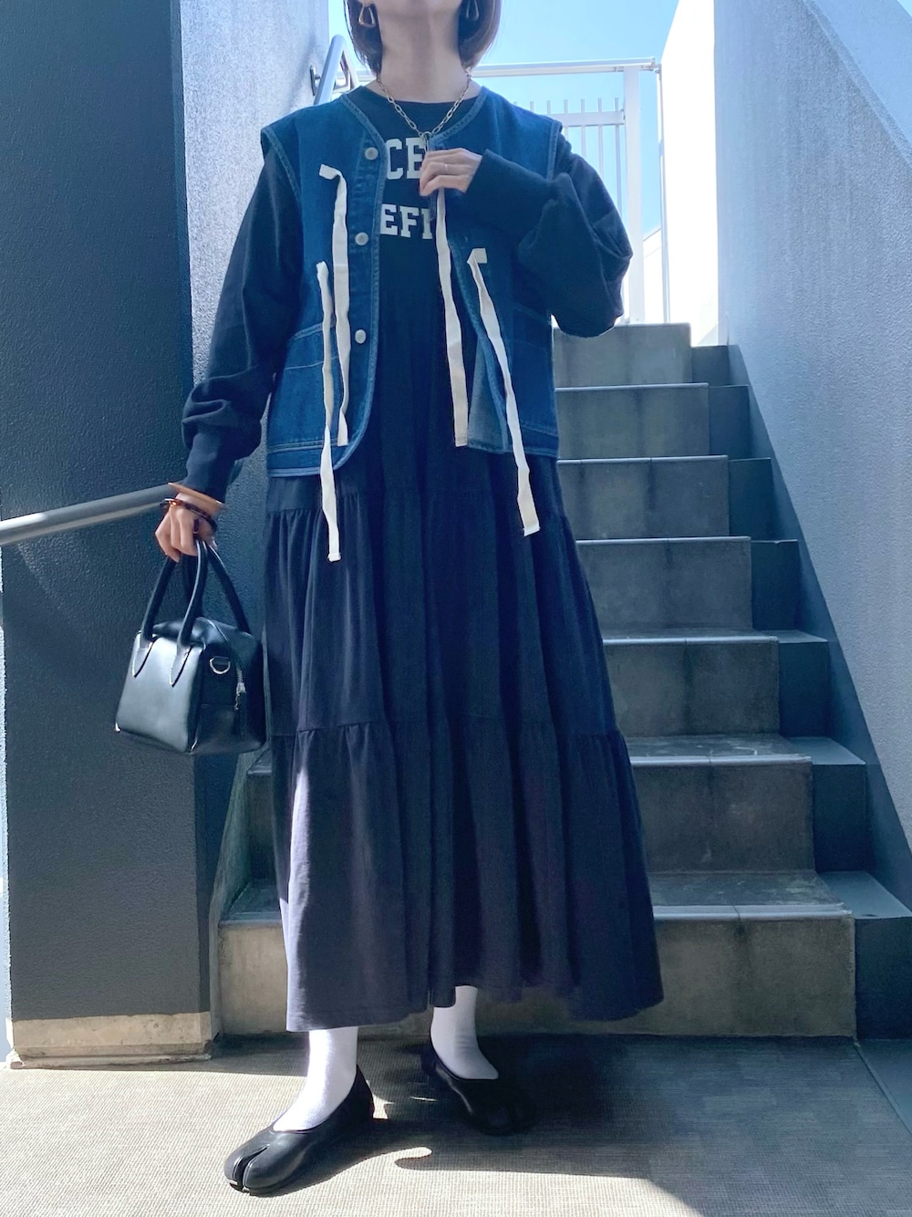 memeのワンピース「ウエスト切替ティアードワンピース」を使ったコーディネート