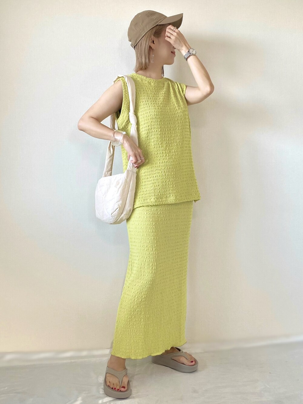 Shellyislandさんの 涼しげなカットソー&スカートがNew in💚 🔸 Shellyisland ☑︎ 楊柳カットノースリーブカットソー ☑︎ 楊柳カットタイトスカート [color]ライトグリーン [size]FREE 夏に向けてサラッと着られるカットソー&スカート🌿 凹凸のある素材で高見えなデザイン。 今回はセットアップで着てみました🫶💓 カットソーは長めの着丈で、腰まわりの体型カバーも✌️ スカートはウエストゴムで楽ちんなナローシルエット♡ バックスリット入りで歩きやすさもバッチリ✨ カットソーもスカートも、それぞれ手持ちのお洋服と合わせても着られるし重宝しそう🥰 私が着用している夏らしいcolorのライトグリーンと、ブラック、ホワイトもあるよ◎ ぜひcheckしてみてね🌼 コーデは セットアップに、キャップ&サンダルを合わせた夏のお出かけstyleに🌿 Instagram PARTE ▷▷@meme158cm Lemon8
