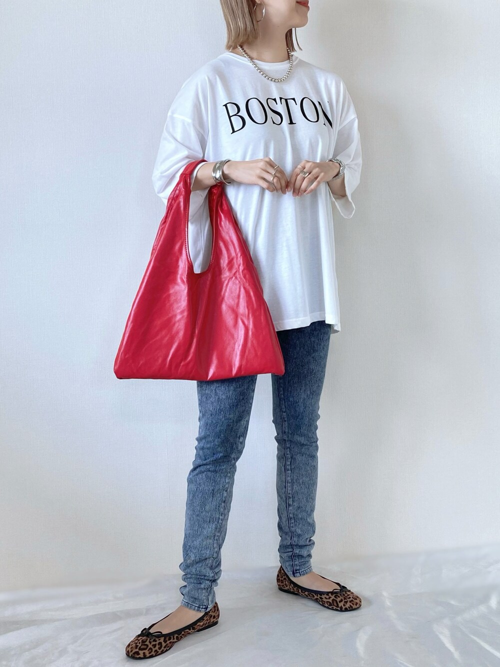 ロゴTとスキニーデニムのシンプルコーデ♡ 真っ赤なBagをポイントに🍎 ロゴTはお友達とオソロでget🫶🩵 Instagram PARTE ▷▷@meme158cm Lemon8