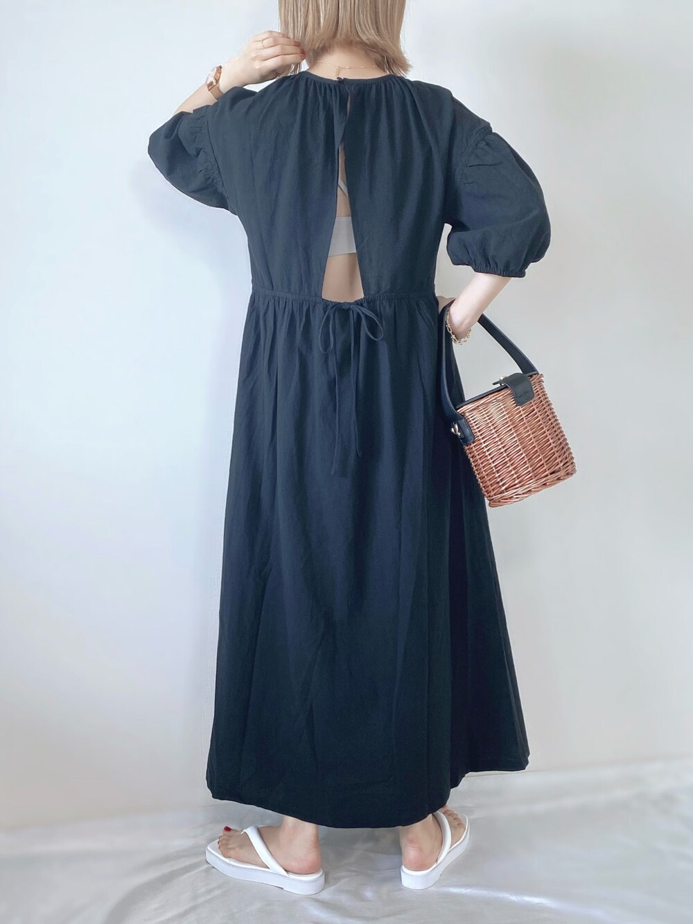 memeのワンピース「バックデザインワンピース」を使ったコーディネート