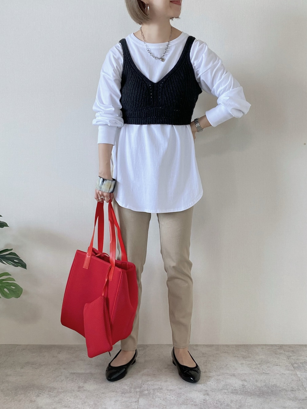 ロンT × ビスチェ🫧 ニットビスチェを合わせて大人カジュアルに♡ 赤のバッグを差し色にしてみました🍅 Instagram PARTE ▷▶︎@meme158cm Lemon8