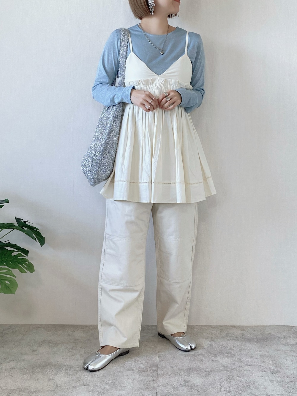 お気に入りのキャミに 最近getしたラメトップスをレイヤード🫶🏻 淡いブルーのラメトップス🩵 春らしいカラーが涼しげ〜🌿🫧 最近、ラメにハマってる😚 Instagram PARTE ▷▶︎@meme158cm Lemon8