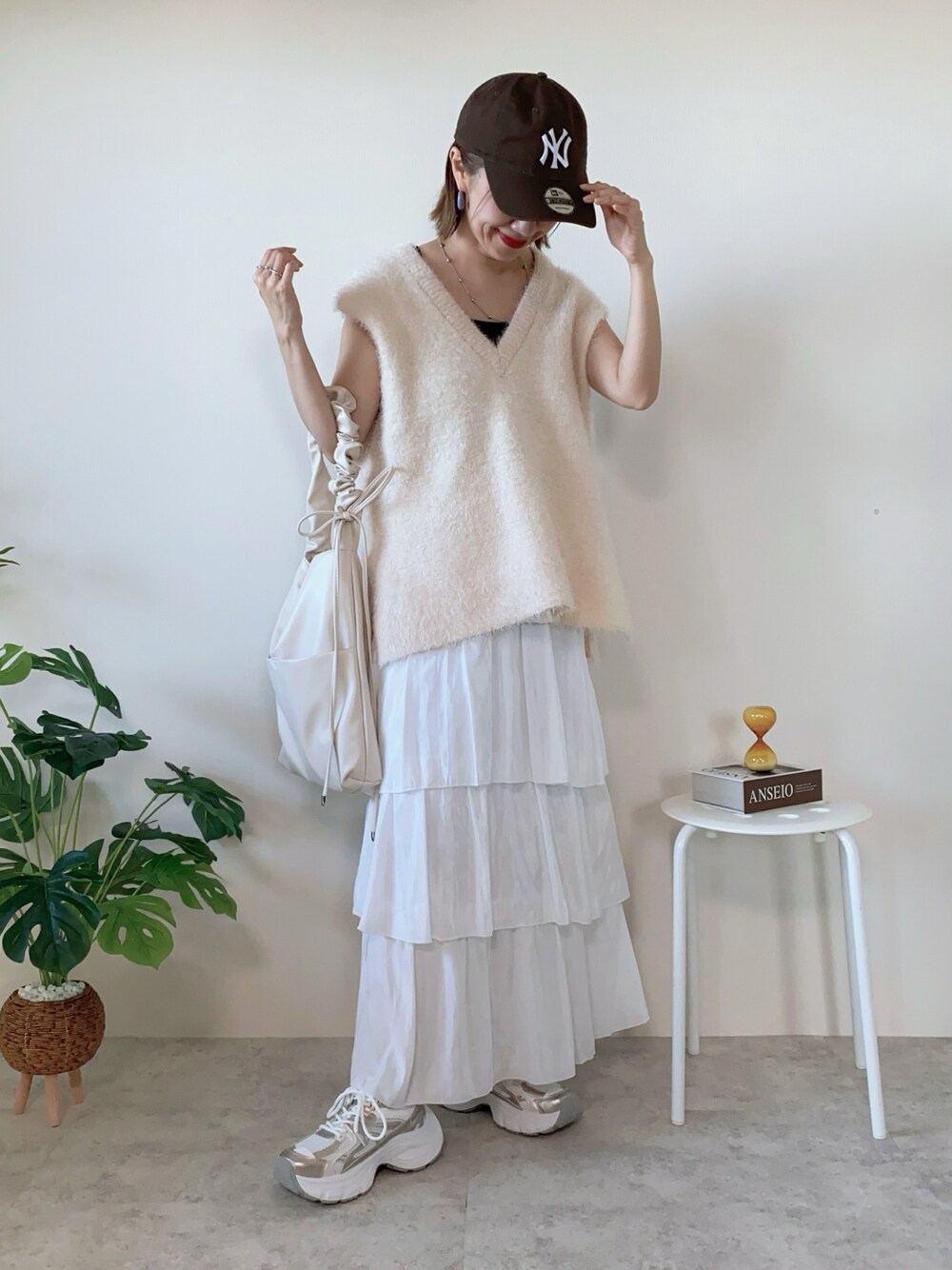 秋のホワイトコーデ🤍🍂 モケモケベスト×ティアードスカート🫶🏻 甘くなりすぎないように キャップとスニーカーを合わせてみたよ👟 キャップはお気に入りすぎて4色目のブラウンを最近購入しました🍫🤎 バッグはデザイン性も荷物の収納力も100点の floristさんのバッグを♡ くしゅくしゅデザインがコーデのpointに🥰 Instagram PARTE ▷ ▶︎@meme158cm Lemon8