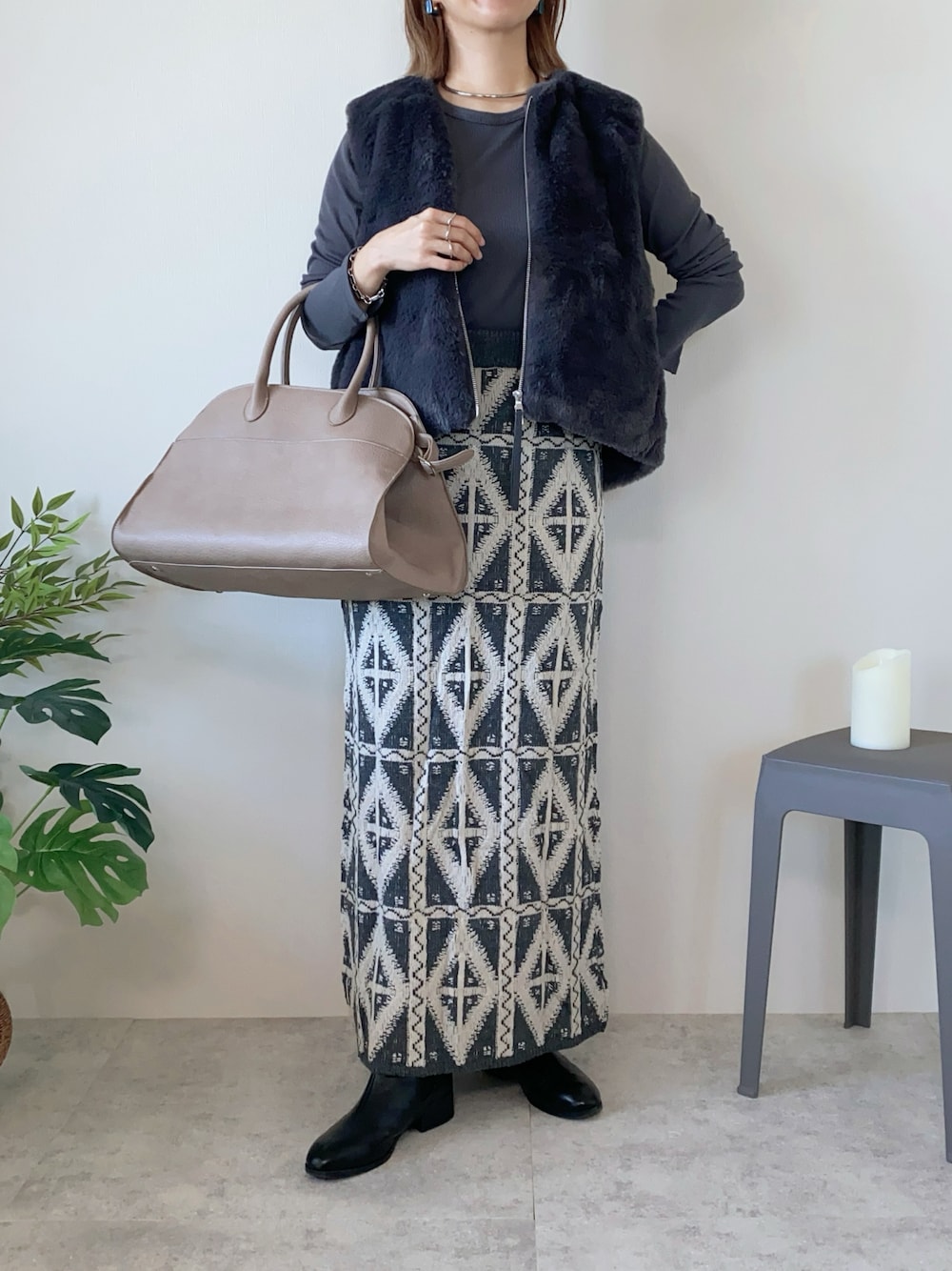 チャコールグレーなコーデ🫶🏻🩶 柄のニットスカートは 最近ZOZOでgetしました🥰 お腹まわりは気になるので🤭 ファーベストでカモフラージュ♡ Instagram PARTE ▷▶︎@meme158cm Lemon8
