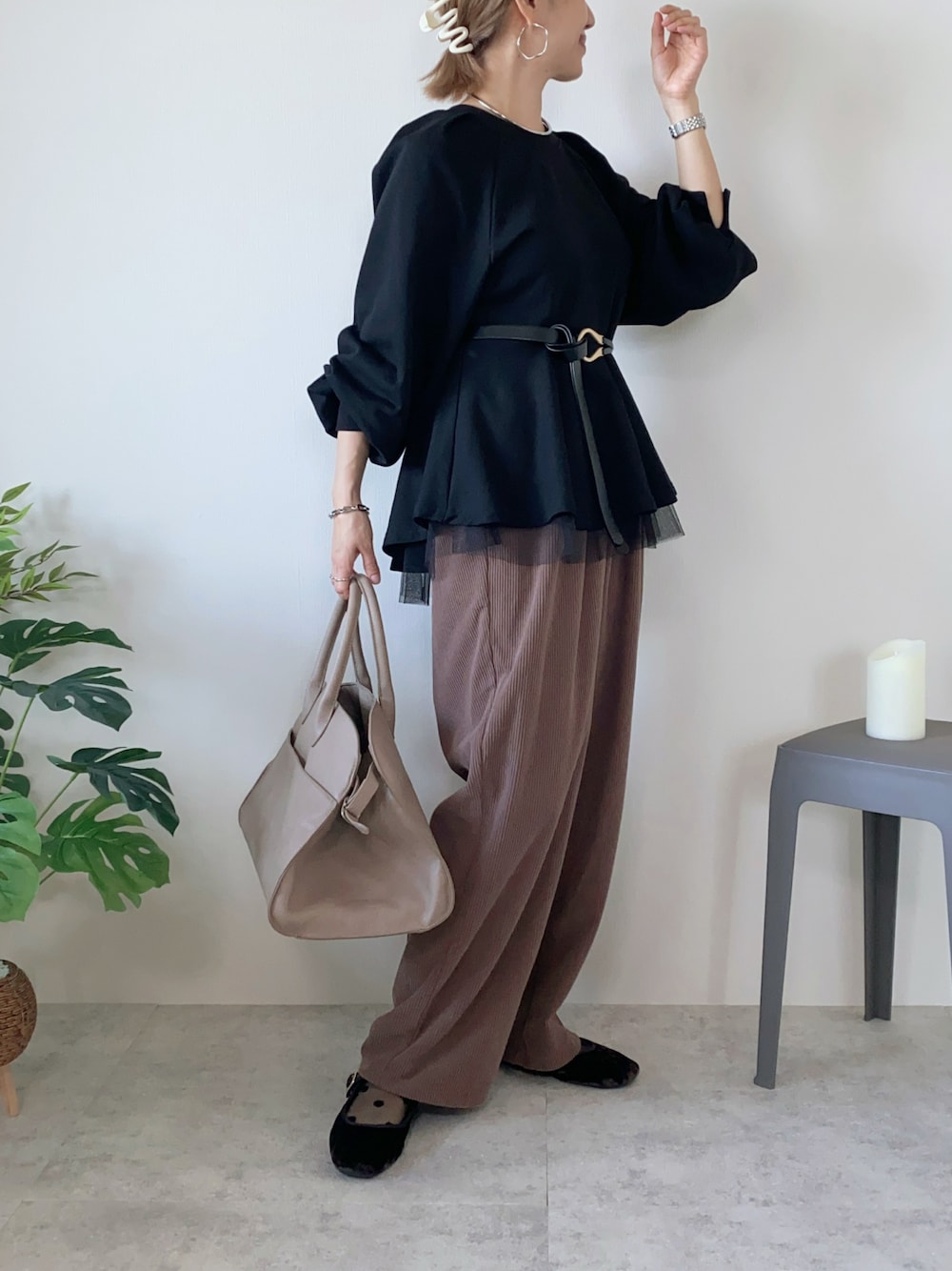 ペプラムトップスをベルトでウエストマーク♡´、 memeコラボのトップスを こうやって着るのも良いかも☺️🖤 🔸 JUNOAH × meme ☑︎ ペプラムチュールスウェットトップス [color]ブラック/アイボリー/杢グレー [size]M / L / XL 🏷️ZOZOTOWNにて販売中です 今回はブラック/ Mサイズ着用👩🏻🦰 季節感の出るコーデュロイパンツを合わせて着てみました🍂🤎 結ぶタイプのベルトを巻いてみたら、可愛すぎました🥰 これカナリお気に入り🫶🏻💞 チュールトップスは、 腰まわりの体型カバーにもなるのでおすすめです♡ Instagram PARTE ▷▶︎@meme158cm Lemon8