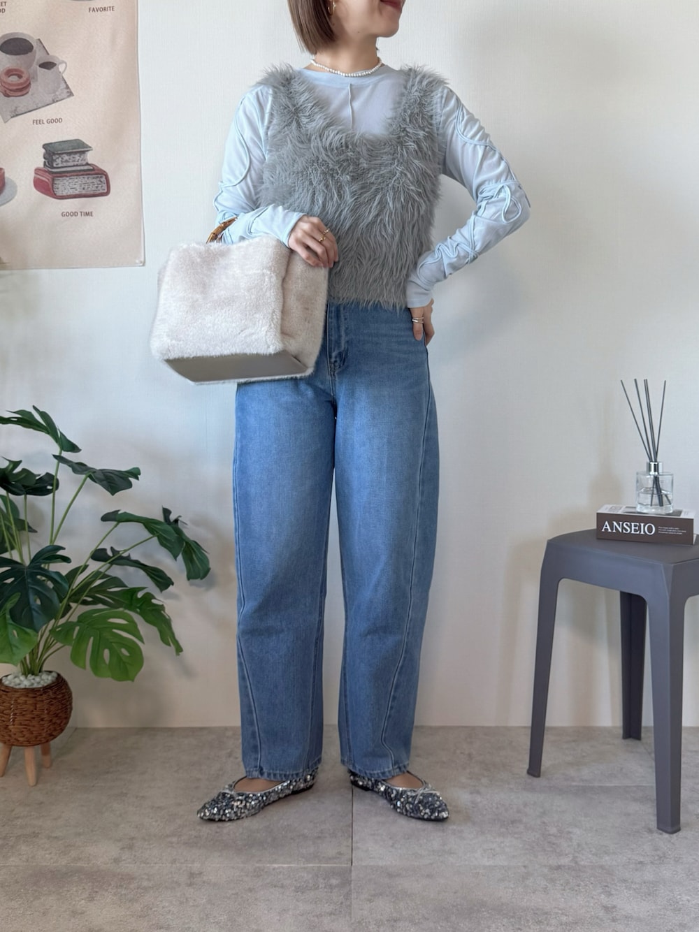 春色コーデ☁️🩵🫧 シアートップスとバッグは 最近のZOZO購入品🫶🏻 シャギーニットベストを合わせてみたら可愛すぎた🫠♡ 水色とグレーの組み合わせ、いい感じだなー🥹 Instagram PARTE ▷▶︎@meme158cm Lemon8