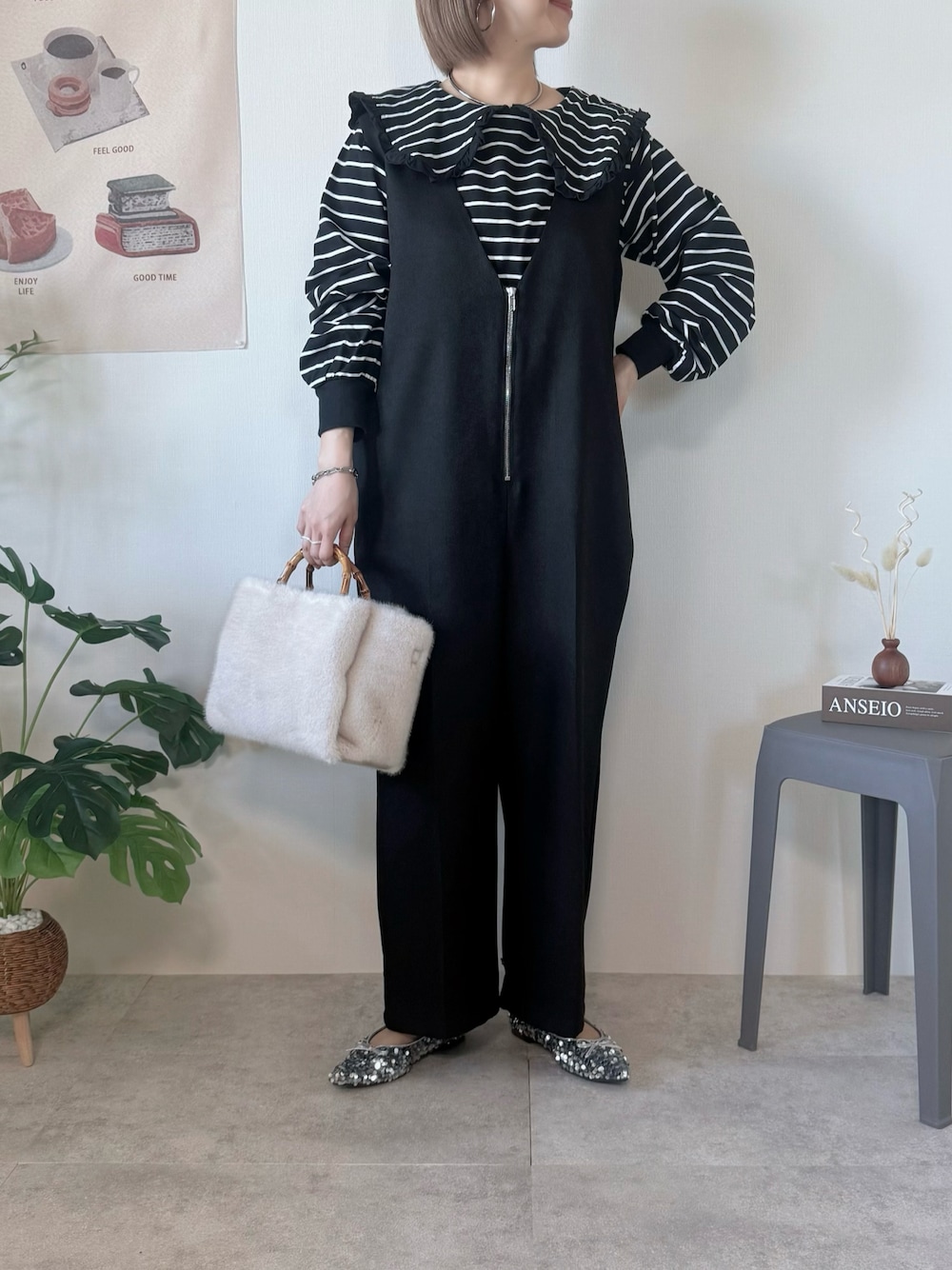 ボーダートップス着まわし🫶🏻 甘めなフリルの丸襟トップスを ハンサムなオールインワンに合わせて、控えめな甘さに😋 春のモノトーンコーデ🤍🖤 Instagram PARTE ▶︎▶︎@meme158cm Lemon8
