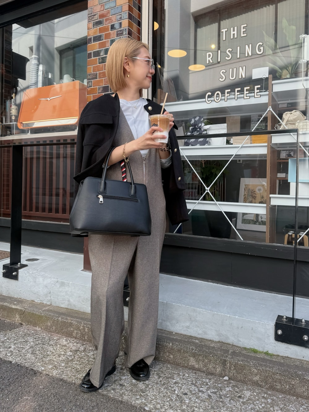 休日、カフェに行ってきました♡ この日は急に20℃も気温が上がって🌿 ちょっと薄着に☺️ 私デザインのオールインワンと、 中にはシアートップス。ジャケットを肩掛け♡ GUのグレーレンズのサングラスつけました🕶️ カフェラテがとっても美味しかった😳♥️ Instagram PARTE ▷▶︎@meme158cm Lemon8