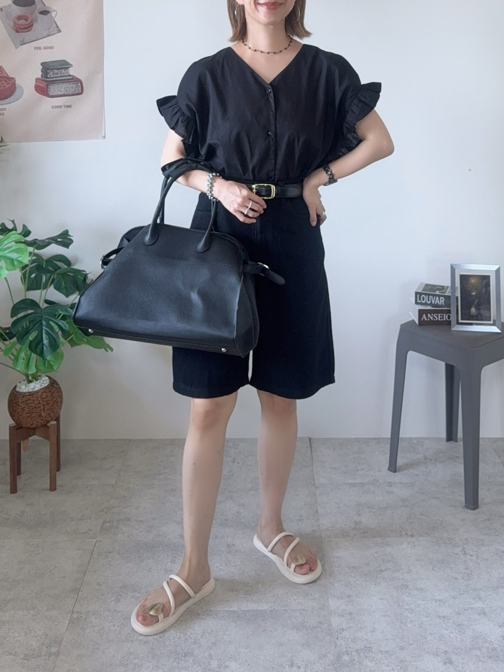 aquagarageさんの お袖が可愛いブラウスコーデ🖤 🔸 aquagarage ☑︎ 涼しげ素材のラッフルスリーブVネックブラウス [品番]kw00555 [color]ブラック [size]M コットン&リネン系素材でサラリと快適に着られるブラウス🌿🫧 ラッフルスリーブが、可愛く二の腕をカバーしてくれるよ🫶🏻 スッキリなVネックで、デコルテは綺麗見え🥰✨ 1枚でサラッとお洒落に仕上がるブラウスです🤍 前を開けて羽織りとして着てもよさそう✌🏻 コーデは ハーフパンツを合わせた大人カジュアルなモノトーンコーデに🖤 Instagram PARTE ▷▶︎@meme158cm Lemon8