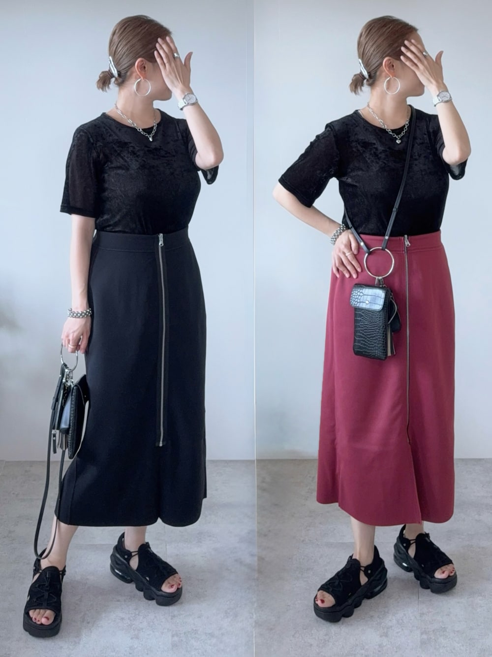 このスカート! リバーシブルなんです😚🖤❤️ 🔸 shetila ☑︎ 【リバーシブル】フロントジップ ストレッチスカート [color]ブラック [size]FREE ブラック×ワインのリバーシブルスカート🫶🏻 ひっくり返すだけで簡単に色を変えて楽しめます🥰 タイトスカートって私はなかなか選ばないんだけど これはストレッチがきいていてめちゃめちゃ穿きやすい😳💯✨ 綺麗なシルエットでビックリしちゃった♡ 前にスリット入りで女性らしさも✨ ウエストは後ろがゴム仕様なので楽ちん✌🏻 今から秋まで着られるから重宝すること間違いなしです🤍 他のカラーも可愛かったので ぜひcheckしてみてね! コーデは ベロアシアーのトップスを合わせて、ちょこっと秋らしく🍂 寒くなってきたらブーツも合わせたい👢✨ Instagram PARTE ▷▶︎@meme158cm Lemon8