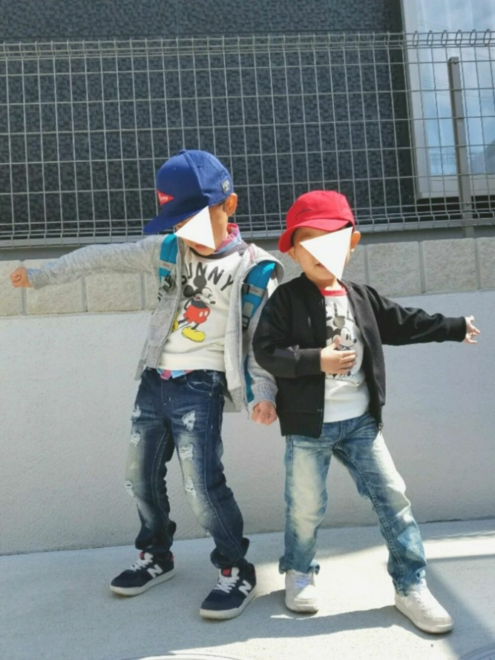 ご覧くださりありがとうございます♡ 初心者ですので失礼があればすみません😣 今日のha-kun&so-tanコーデ👦 グローバルワークのミッキーのカットソーを色ちがいで着用しました🎶 2人とも仮面ライダーが大好きで マイティブラザーズのポーズをきめているところです☺