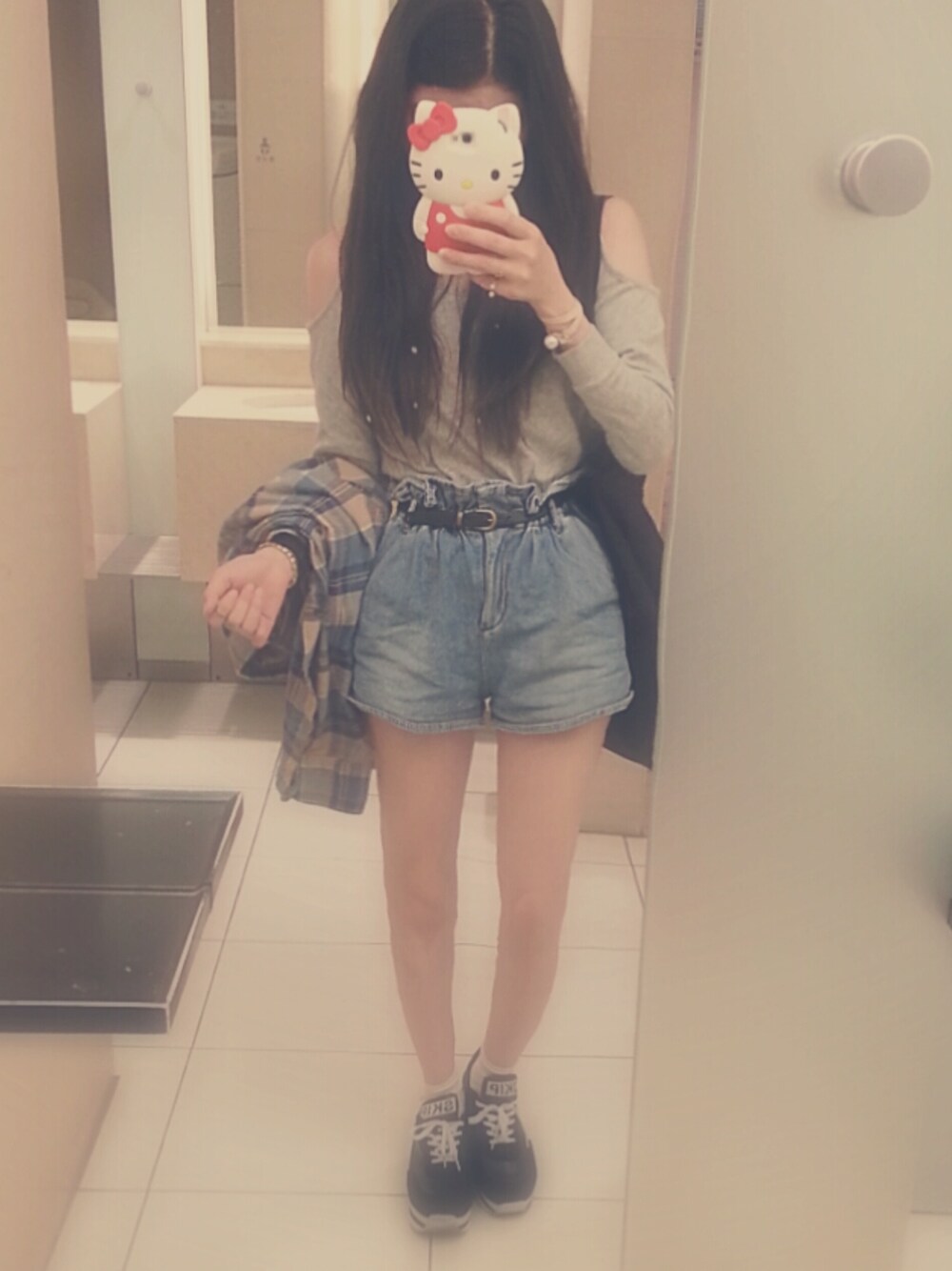 カフェでお勉強コーデ。 肩あきトップス : Kastane デニムショーパン : dazzlin スニーカー : WEGO チェックシャツ : used トートバッグ : NADIA かみのけボサボサ。 バックは参考書でボコボコ。 내일도 홧팅