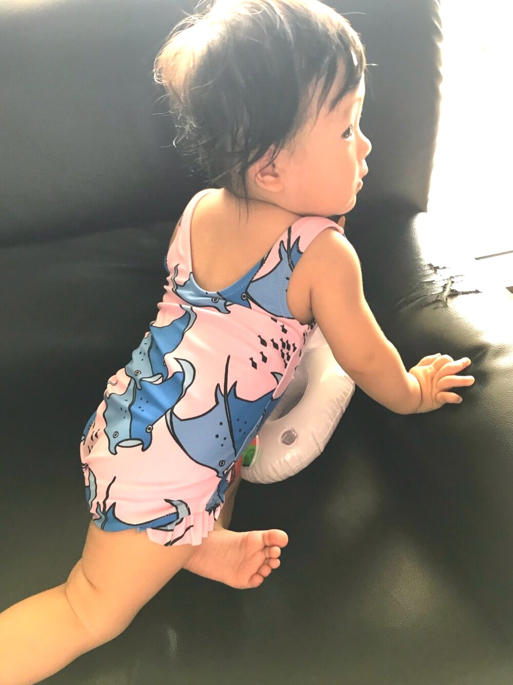 実家にてプール開きしました🙌🏻 ネクストの水着は9-12monthを購入👙 まだちょっぴり大きい😅 これまた来年も着れますように🙏笑 裾?のヒラヒラも写ってる写真がこれしかなくて変なポーズに😅 エイ柄が可愛いな〜〜っ💕🐠
