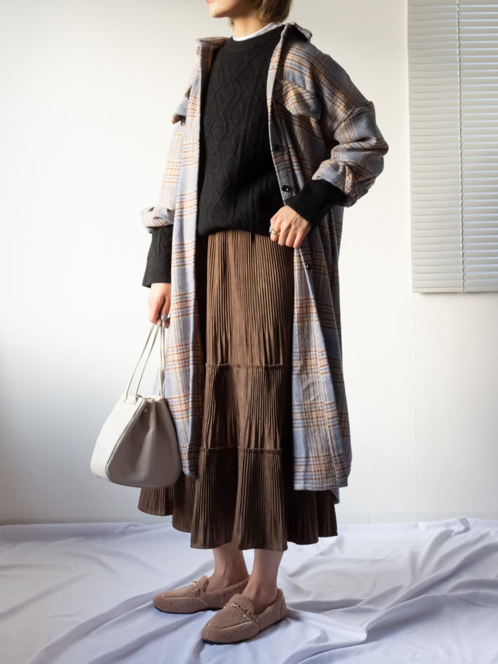 me+emselectのスカート「マットベロアプリーツスカート」を使ったコーディネート