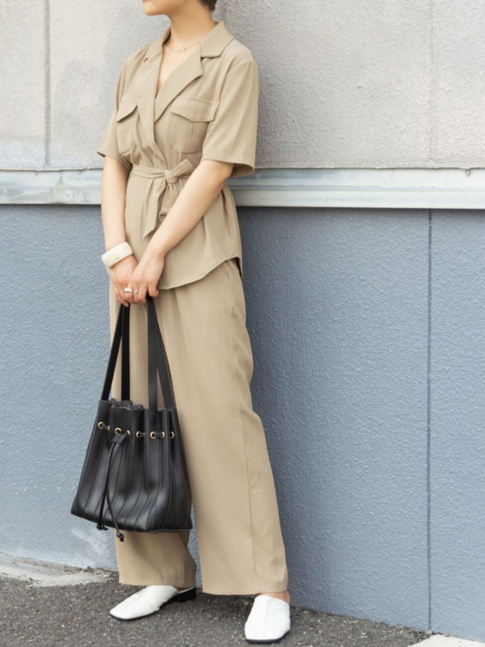 me+emselectのショルダーバッグ「ポーチ付きプリーツ巾着バッグ」を使ったコーディネート