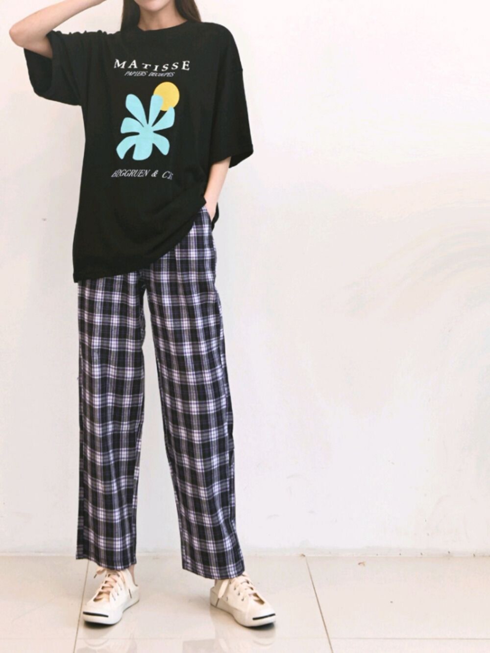 おしゃれなアートデザインとゆるシルエットが 韓国っぽコーデを叶えてくれるビッグTシャツとラクラクな履き心地なのにオシャレ見えが叶うオトナ女子のためのリラクシーチェックパンツを合わせたコーデ🙆♀️ me+emselect instagramにてお得なセール情報や新着商品チェックできます! __________________________ instagram : @meemselect __________________________