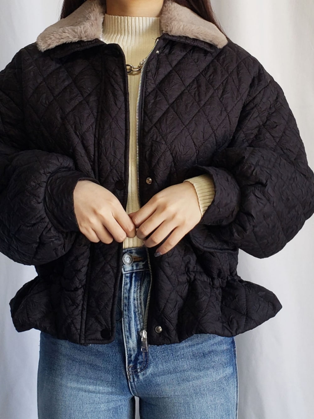 me+emselectのブルゾン「2WAY フェイクファー襟クリンクルキルティングブルゾン」を使ったコーディネート