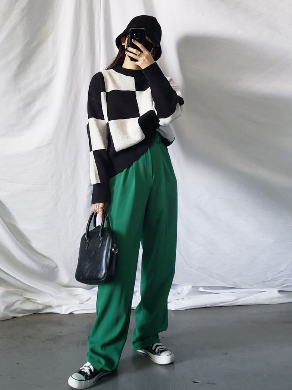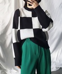me+emselectのニット/セーター「ツートーンブロックチェックワイドニット」を使ったコーディネート