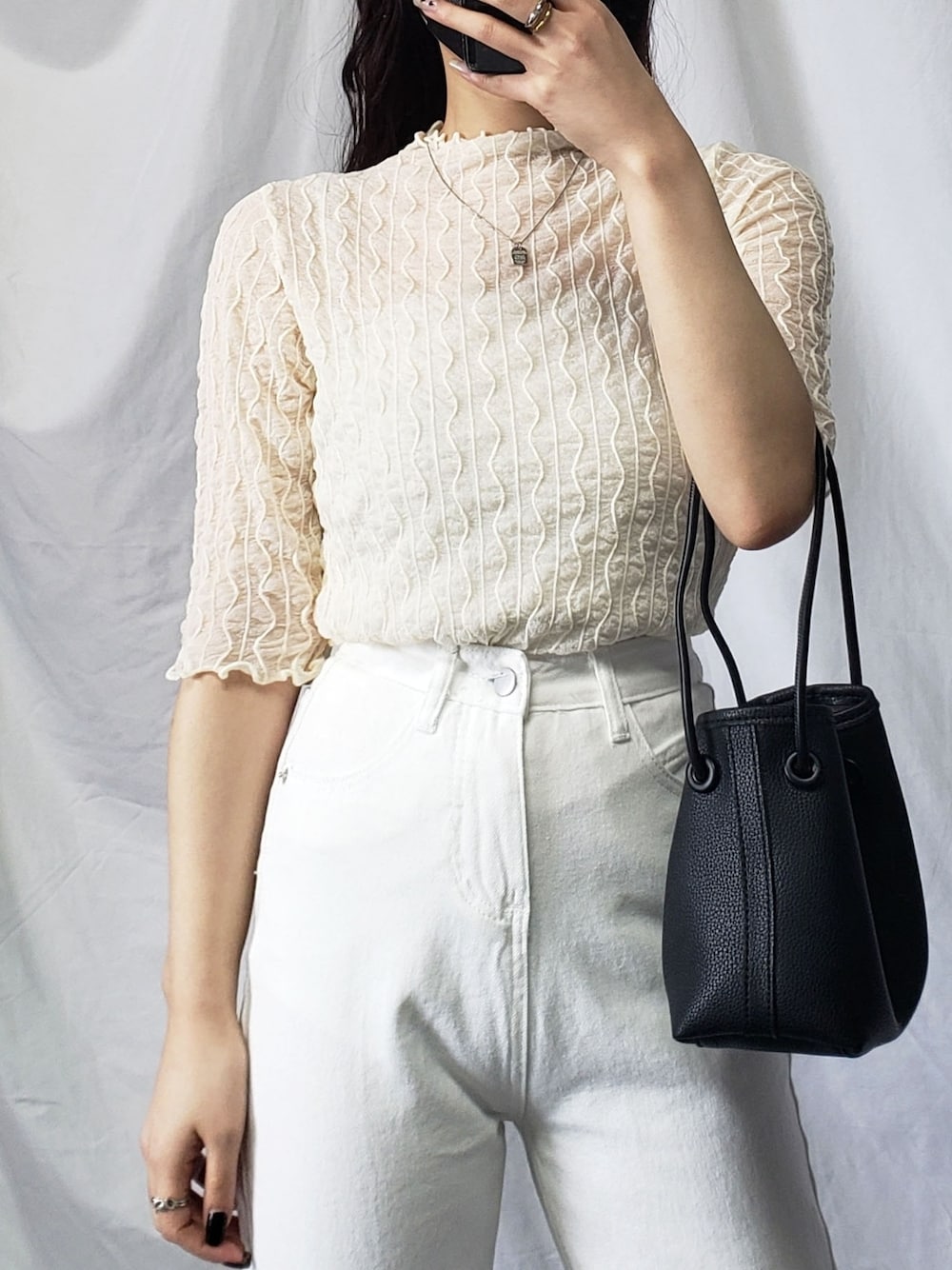 me+emselectのハンドバッグ「【ポーチ付】スムースレザー巾着ハンドバッグ【数量限定販売】」を使ったコーディネート