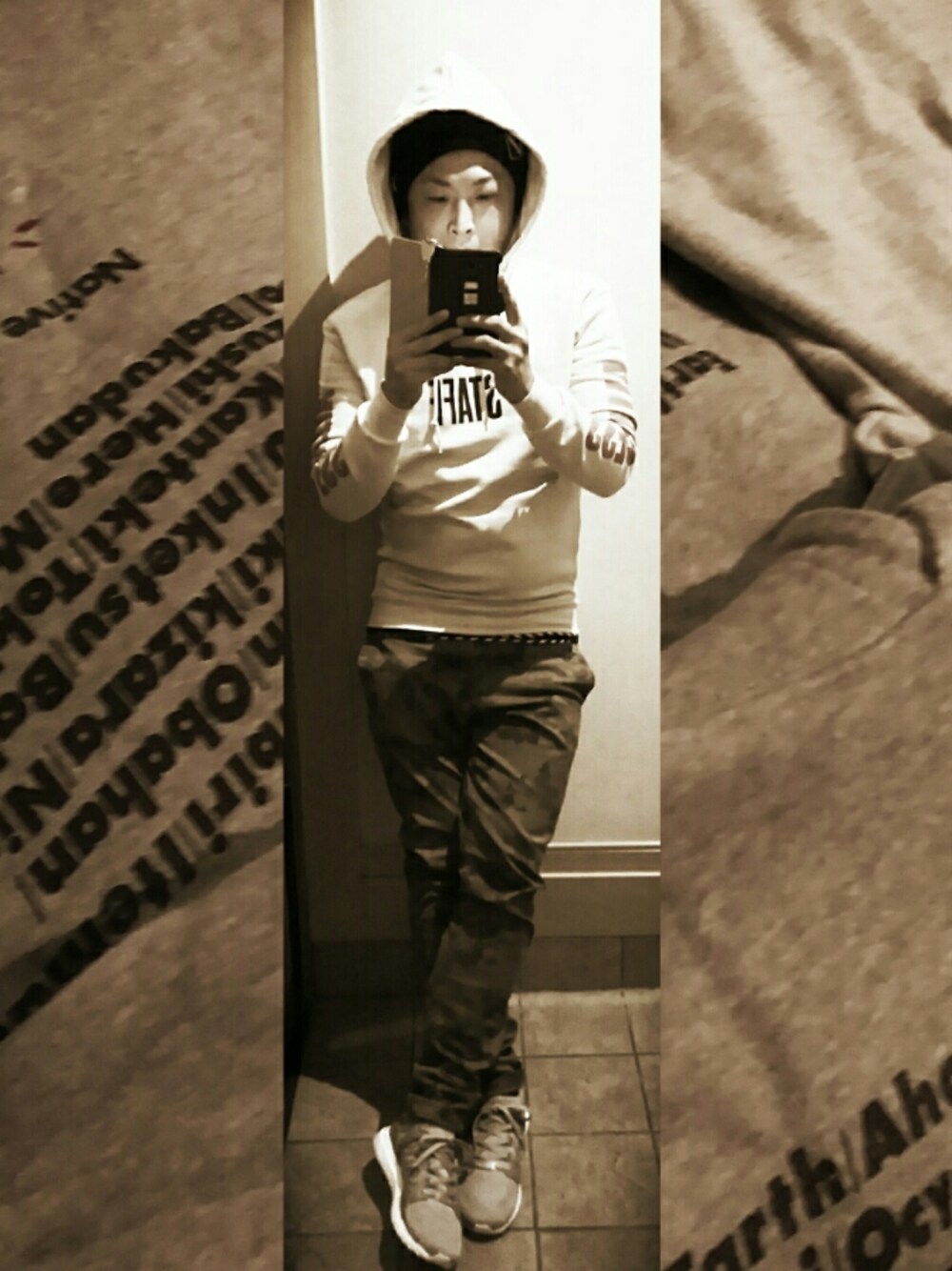 ベージュ系のパーカーを着用したメンズの冬コーディネートの1枚目の写真