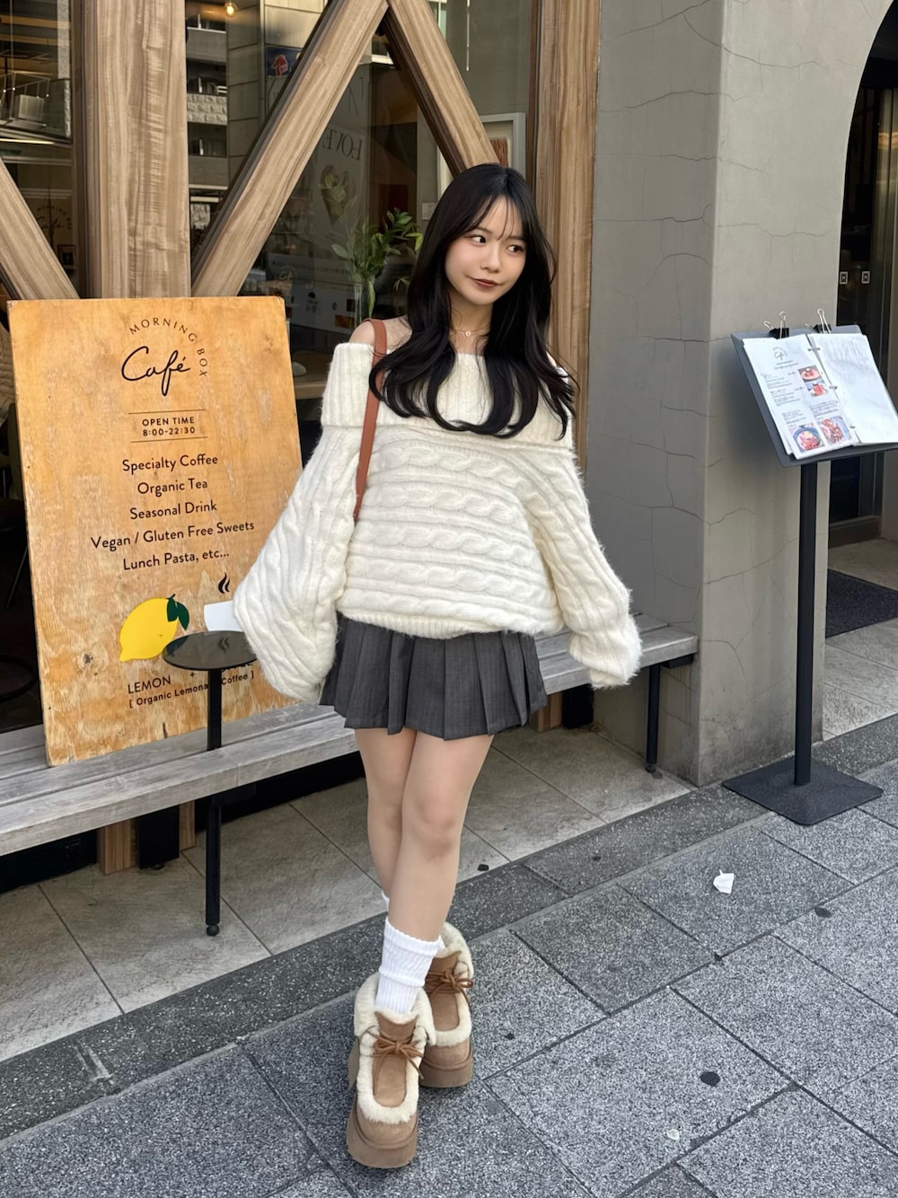 オフショルのニットにミニ丈のスカートを合わせたコーデ。 UGGのブーツはこの冬お気に入り🦦