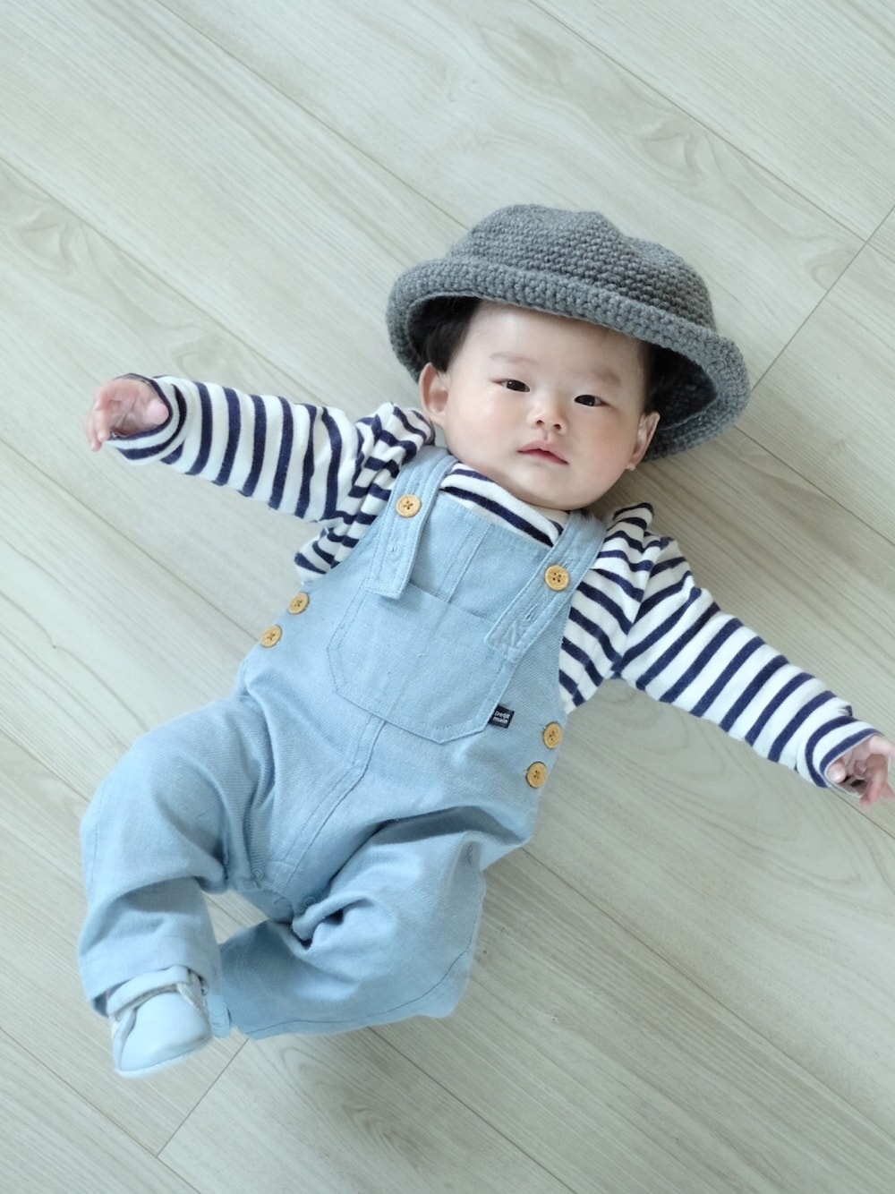 いつもありがとうございます♪ おさがりのサロペ❣️ 遊んでると思ったら 勝手に寝ている、簡単なオトコ。 0歳6ヶ月*62cm*7.5kg