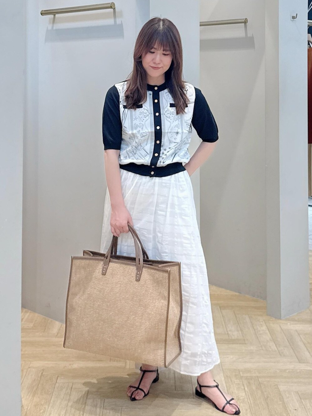 まだまだ暑い日が続きそうな今年の夏。 スカーフをつけずにスカーフ柄で晩夏-秋を楽しめるアイテムが登場致しました! シャリっと涼しいニット素材で着心地がよいのであえてリラックスしたスタイリングに致しました◯ ※バッグは一部店舗でお取り扱いがございます。 詳しくは店頭にお問い合わせ下さいませ。 ※サンダルは私物になります。