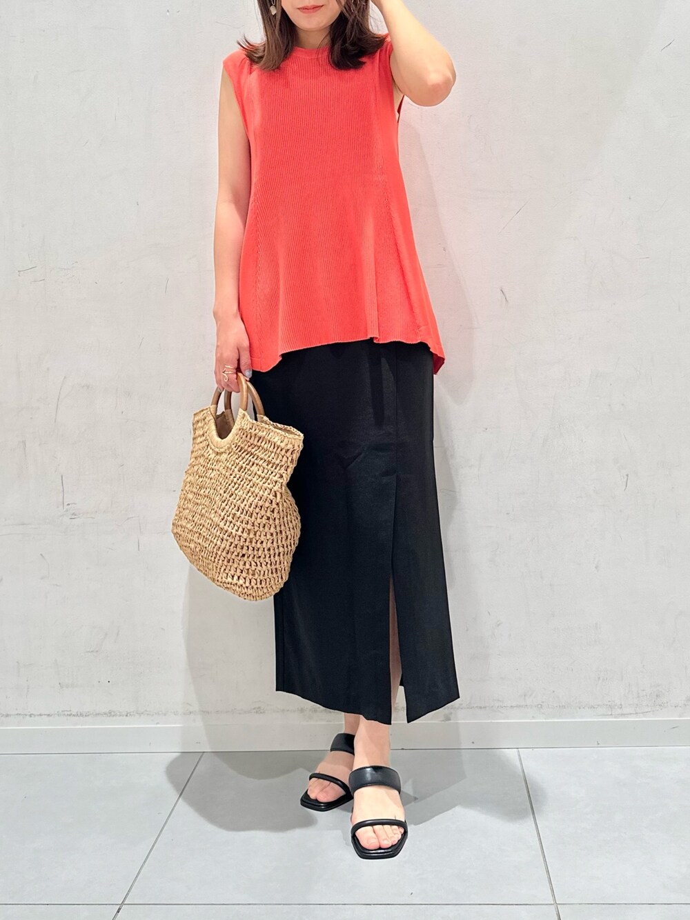 スリットタイトスカートとフレンチスリーブセーターを合わせたオフィスカジュアルスタイルです! フレアスリーブなので肩周りもカバーでき◎ Aラインシルエットが細見えするニットでタイトスカートとの相性◎ リネンライク素材のタイトスカートはこれからの時期にサラッと履けるオススメスカートです!