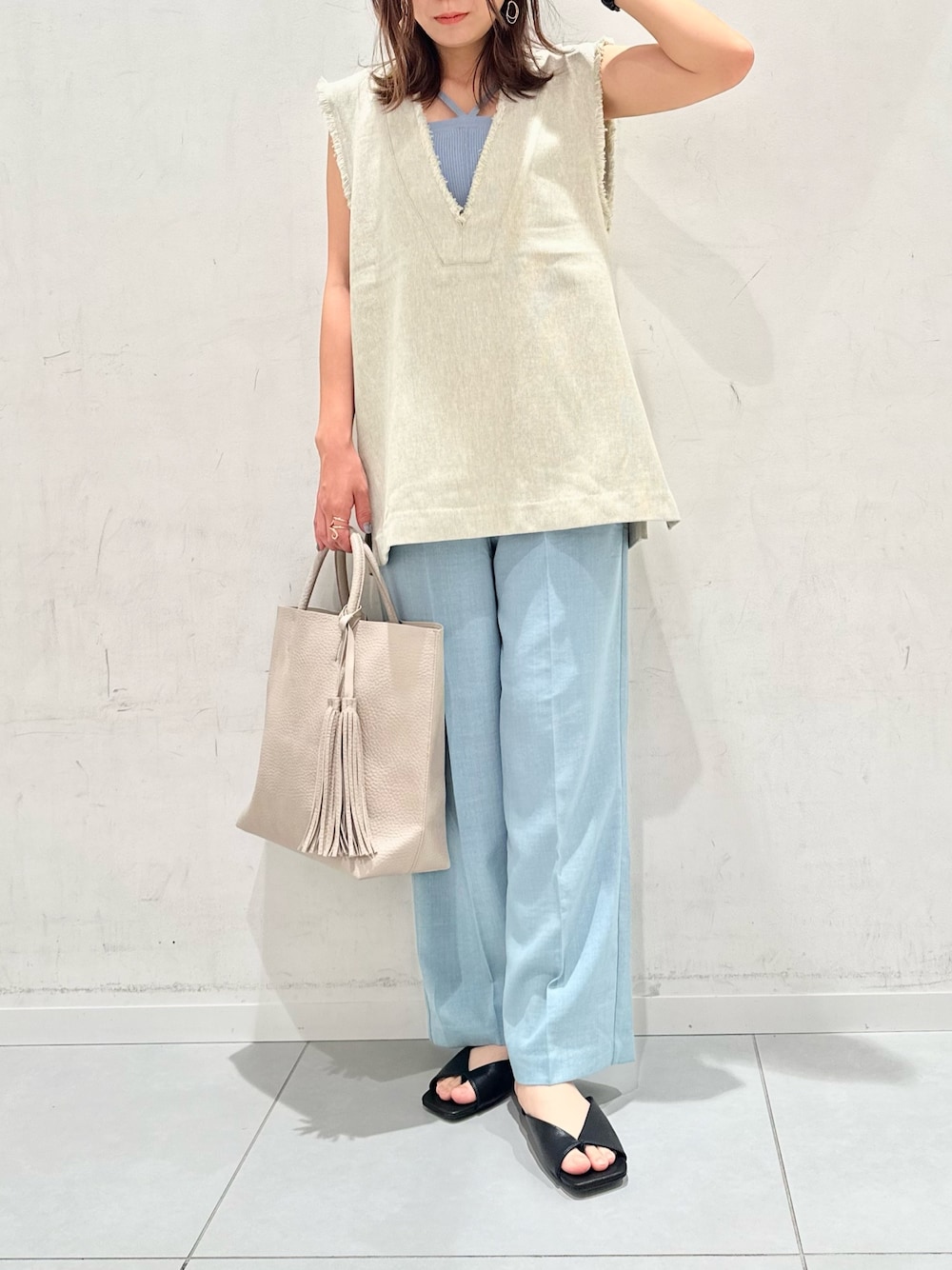 ワイドパンツとジレを合わせた大人カジュアルスタイルです! ジレはツイード素材ですが夏らしさもあり生地も薄く◎ インナーにカップツキキャミなどで合わせるのが今年のオススメです! ワイドパンツはリネンライクワイドパンツの新色です! 爽やかな印象になり、キレイめなのでオンオフ使える万能パンツです。
