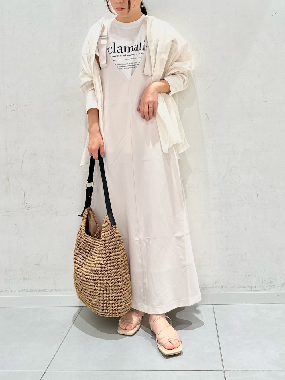 フレアジャンスカにロゴTを合わせたカジュアルスタイルです! ワントーンで合わせた甘すぎないようにシャツを羽織り! ロゴTがフレンチスリーブなので、まだまだ羽織があるとエアコン対策にも◎ ワンピースは肩紐で調節可能で、着丈はcompactサイズでもしっかりあります! ロングが好きな方にはオススメです!