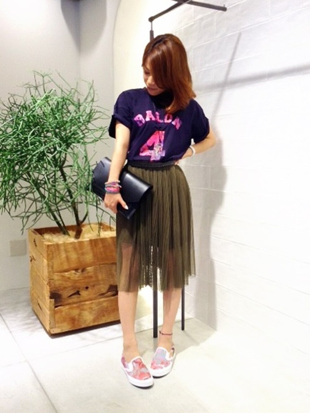こんにちは\( ˆ ˆ )/ 昨日はダイビングで和歌山の御坊まで行って来ましたー\( ˆ ˆ )/もう、ほんと最高でした♡ 波の音聞いてるだけで癒されて、海の中の青さに更に癒されて… すでに海が恋しい✭ とりあえず余韻に浸りながら… 真っ赤に焼けた背中と全身筋肉痛で今日はヒーヒーゆーとります( ´ ▽ ` )ノ ✭ 今日はチュールスカート♪ カーキにネイビーで差し色はピンク♪♪ 新作のTシャツとスニーカー可愛いー\( ˆ ˆ )/