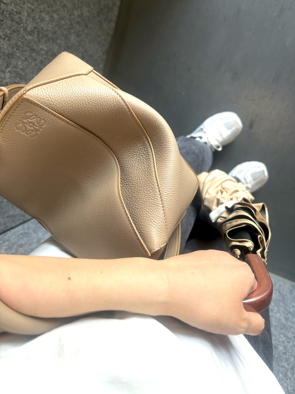 meganemoのハンドバッグ「パズルバッグ スモール (ソフトグレインカーフ)」を使ったコーディネート