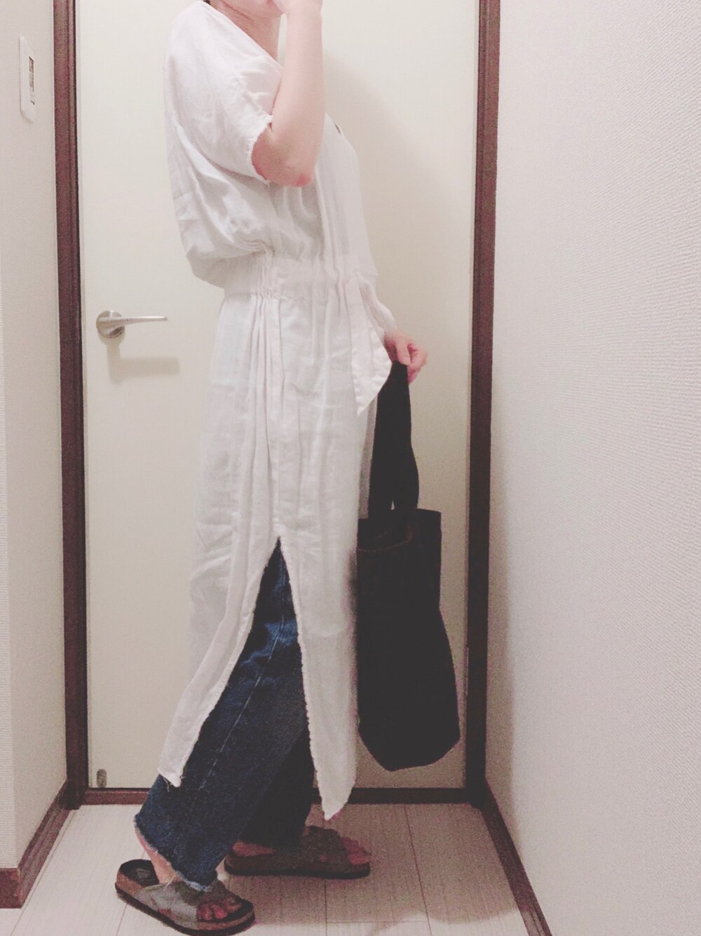 ZARAのリネンワンピース ウエストをきゅっと絞ると お腹が細見えする優れもの。 GU神デニムは切りっぱなしにしてます。