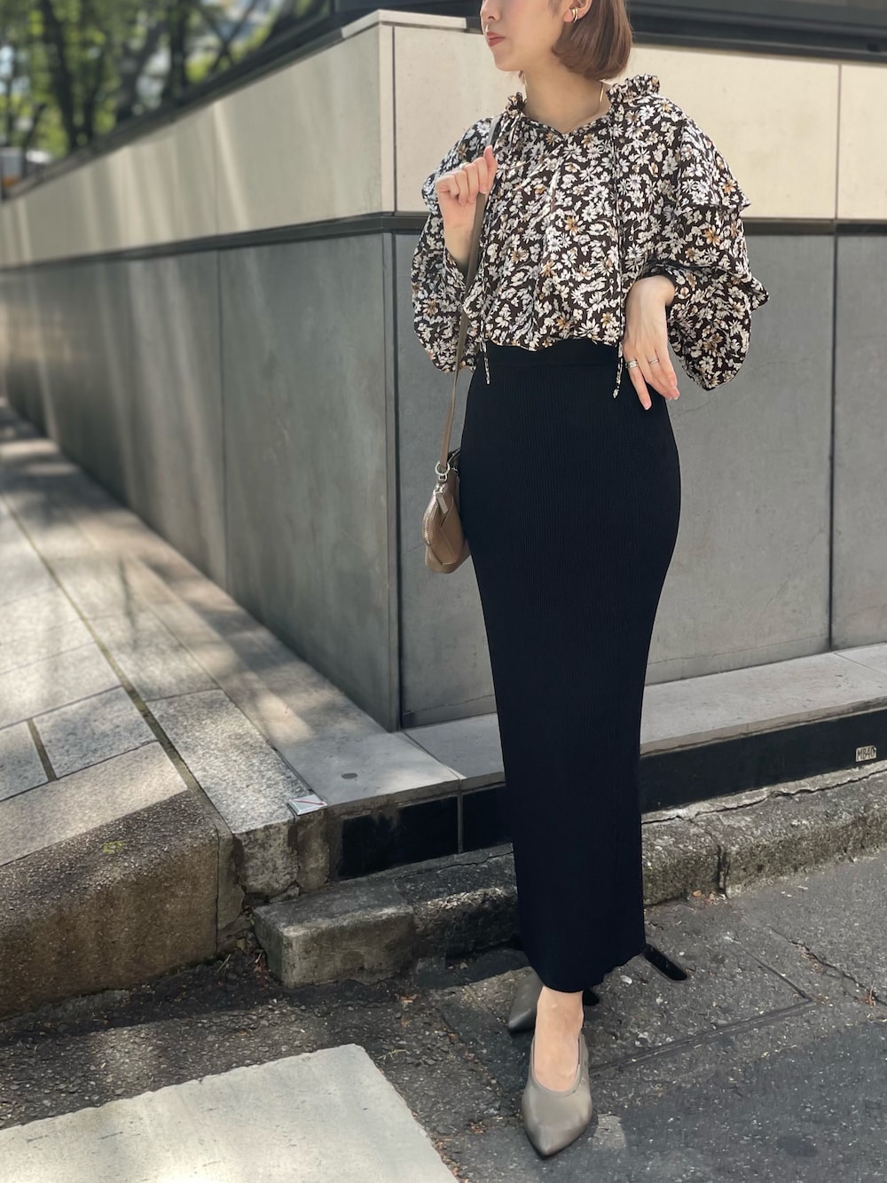 花柄のブラウスにタイトスカート合わせで 女性らしくまとめてみました❤︎