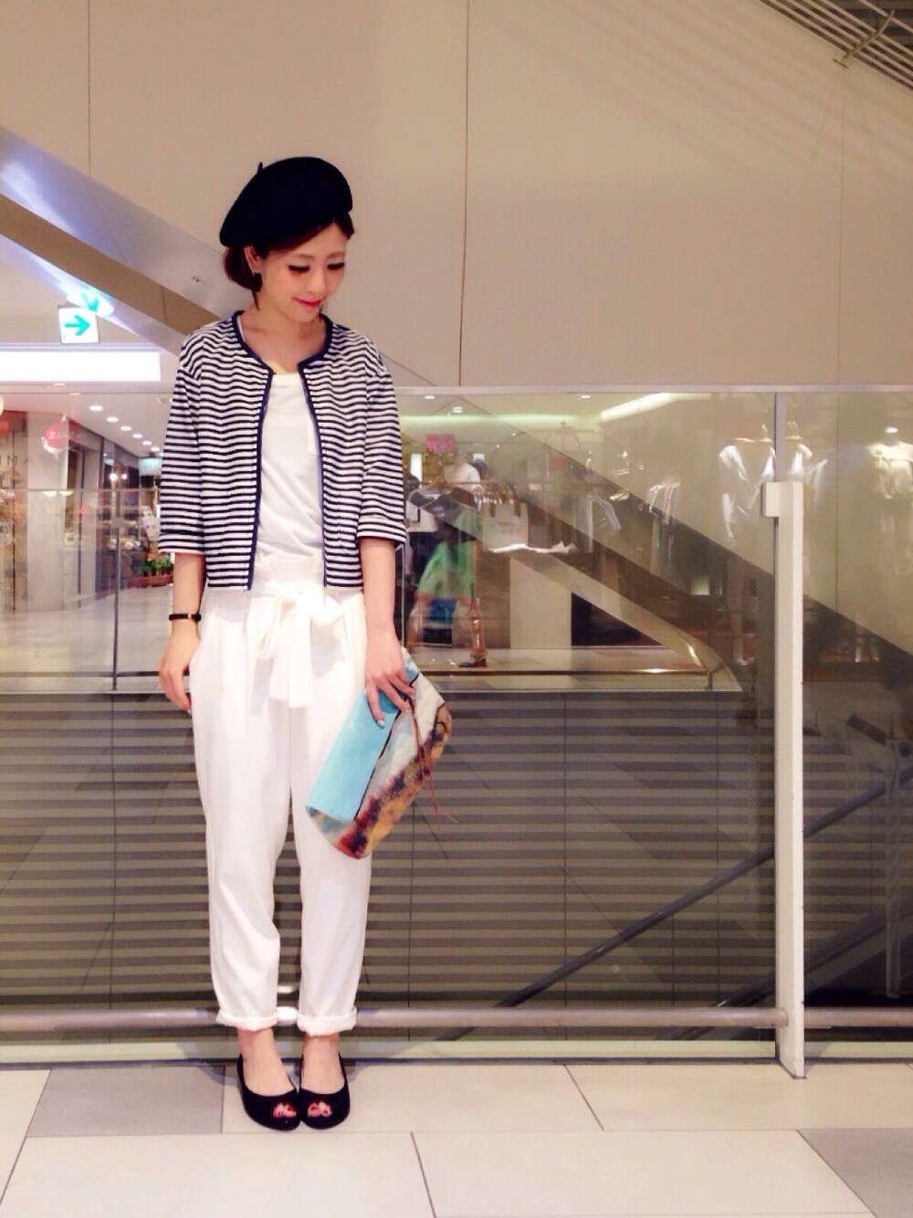 こんばんは! ボーダージャケット、なんかどんどん可愛く見えてきてコーディネートに使いました✨ ※ベレー帽私物 クラッチ、シューズは店頭販売のみです! ジャケットはNETに繋がり次第リンクを貼り ますね!