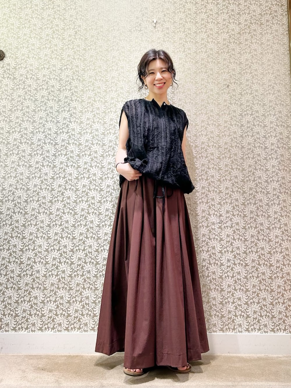 涼しい!オススメスカートコーディネート 《ストライプカットドビーブラウス》 ・トレンド感のある表面変化が魅力のカットドビー生地 ・裾のリボンは裾のブラウジング可能 ・ふんわりしたシルエットで体型カバー力あり 《タックギャザースカート》COOL / 撥水 ・ウエスト総ゴム ・シワにならず毎日でも履きたい楽さ ・オフィスでも履ける 基本 M 足サイズ S 骨格診断 ウェーブ カラー診断 ブルーベース(冬) 体型特徴 下半身しっかり 上半身華奢 腕短め アラフォー