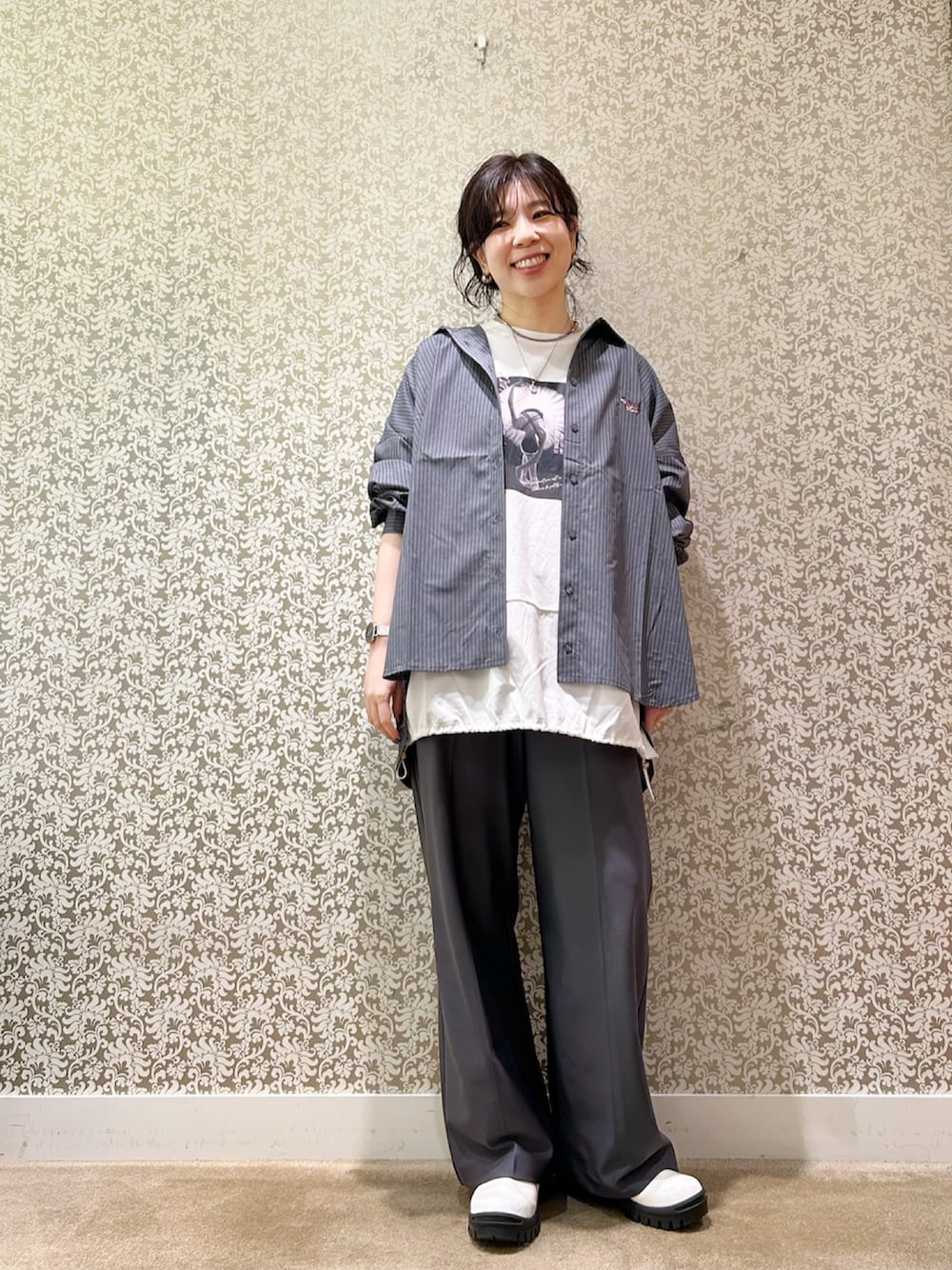 アムールヒョウシャツ / meeny miny ・胸元にワンポイント刺繍を入れたピンストライプシャツ ・柔らかく落ち感があり、肌触りもさらさら。 ・ご自宅の洗濯機で洗えるイージーケア。 ・軽やかでシワになりにくく、デイリーに活躍します バレエダンサープルオーバー ・袖口と裾には、ほのかな光沢とハリ感のある布帛生地をドッキング ・バレエダンサーのモノクロ写真に、筆記体のテキストを重ねたデザインは、甘すぎない大人の写真プリントTシャツ ・裾のドローストリングを絞れば、コクーンシルエットになる もち伸びパンツ ・ゆったりめなストレートワイド ・もちもち素材なのに汗ばむ季節でもサラッとしてる ・ストレッチがしっかり効いていてストレス無し ブーツ ・軽くて履きやすい ・うちっ側にファスナーありで着脱しやすい ・雨の日でも履きやすい合皮 基本 M 足サイズ S 骨格診断 ウェーブ カラー診断 ブルーベース(冬) 体型特徴 下半身しっかり 上半身華奢 腕短め 40代ファッション