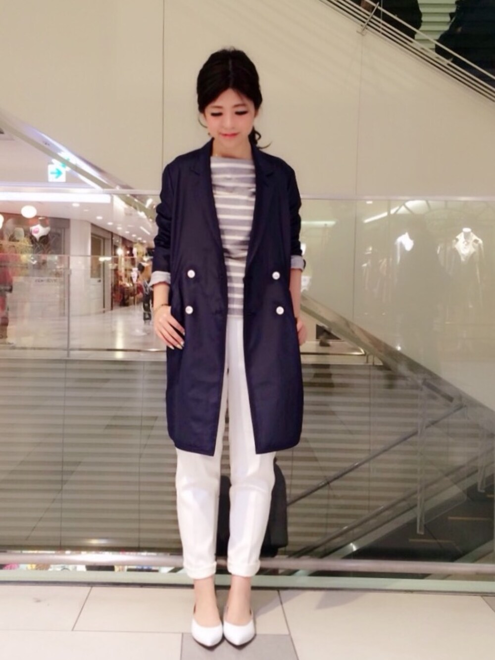 着用コートはネイビー ボーダーカットソーはグレー 共にこの色は店頭販売のみ パンツ、シューズは店頭販売のみ きっちり見えるけど、全身らくちん♬