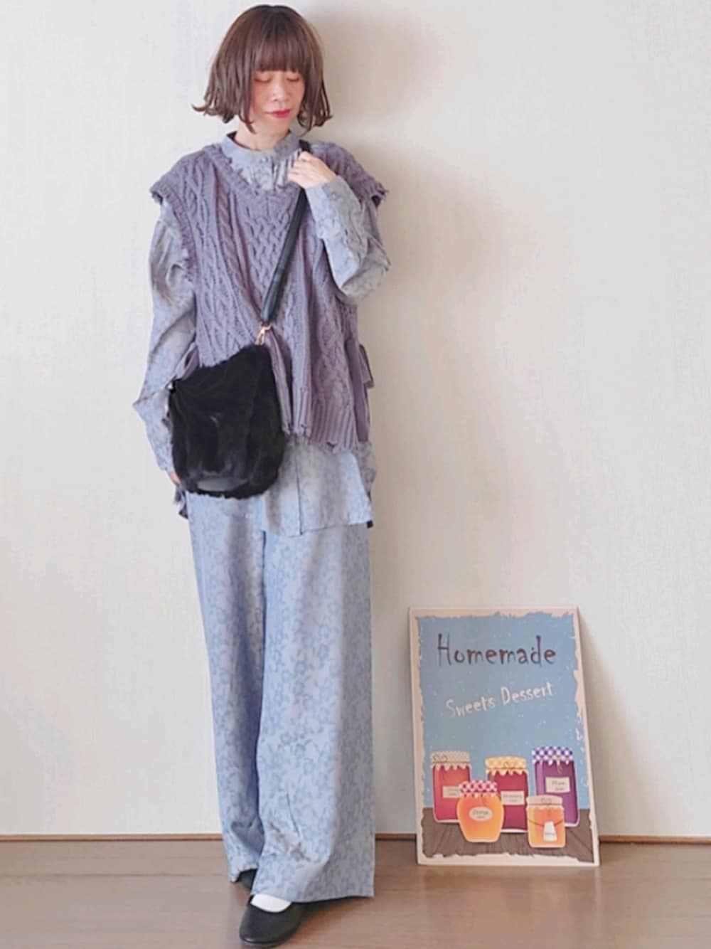 ap retroさんのくすみブルーのジャガードシャツとパンツのセットアップにニットベスト どれも旬なデザイン🌟 本日ZOZOTOWNでクーポン出てるのでぜひcheckしてみてね😉 Riberryさんの2WAYファーバッグ コンパクトに見えるけど結構収納力あるのでよく使ってます✨ なんといってもふわふわの触り心地で幸せな気分になれちゃう💕 #pr