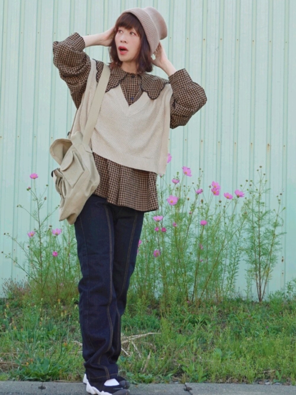 今日は可愛いトレンドアイテムが揃ってる ap retroさんコーデ - 無地・ギンガムチェックスカラップ刺繍ビッグカラーブラウス - バックベルトニットベスト - キリカエセミフレアデニムパンツ 本日ZOZOTOWNで1000円offクーポン出てます😉 #pr