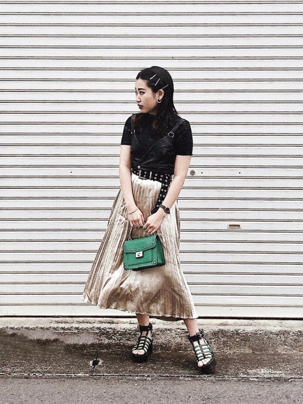 【fashion】 お洒落にフレンチディナーの予定だったのでフェミニンで綺麗目の気分だったのでプリーツスカートを...。 でもやっぱり私らしく、ブラック×ゴールドで強めコーデ。❤︎ 彩度の低いゴールドだったので、アクセ等々はあえて全部シルバー合わせ⛓ ・ ・ ・ 【make up】 それに合わせてメイクもブラックメイク。 目尻の方じゃなくて目頭の上のアイホールのシャドウを濃く広く塗るのがデカ目いくポイント!👀 パーツがキュッと中央に寄って見えます◎ リップはパープル。ビビットカラーだとアイシャドウも派手で、派手派手になっちゃうので、 くすみカラーのパープルをON🍇 メイクの写真はinstagramを見てね👀