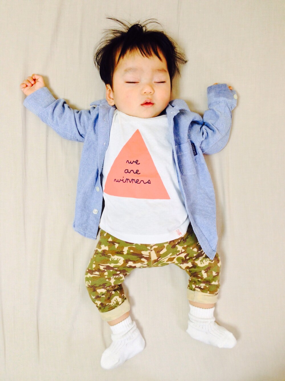 はむはむしながら寝たので袖の色が変わってしまいました…笑 シャツとレギンスの組み合わせ、前回と一緒です。 髪の毛ぽっさぽさ♫ そろそろ切らないと…