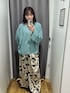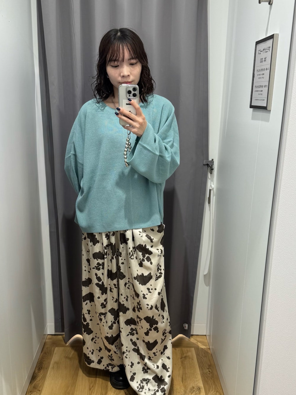 ゆるっとニット×総柄ワイドパンツコーデ 🐄 ミントグリーンのオーバーニットで柔らかい印象に。 存在感のあるアニマル柄パンツを合わせてシンプルだけど主役級バランス◎ 足元はブラックで締めて大人カジュアルに🖤 ✔︎ 体型カバー ✔︎ 楽ちんコーデ ✔︎ 春先まで使える配色